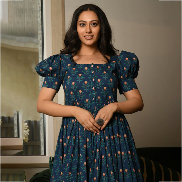 Teal Floral Printed Fit & Flare Cotton Dress